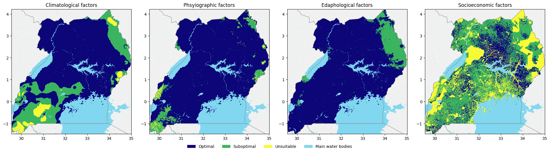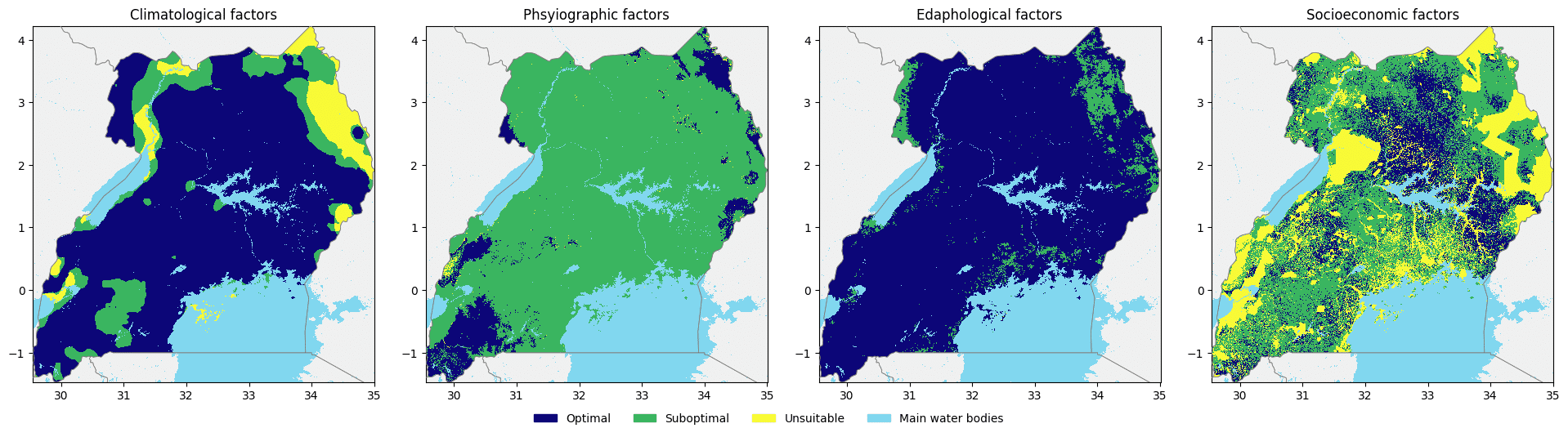 The resulting maps align closely with Uganda’s known coffee-producing regions (see the map in the work of Kyalo et al. 2023). This agreement is not a calibration outcome but an emergent property of combining independent, literature-based constraints.